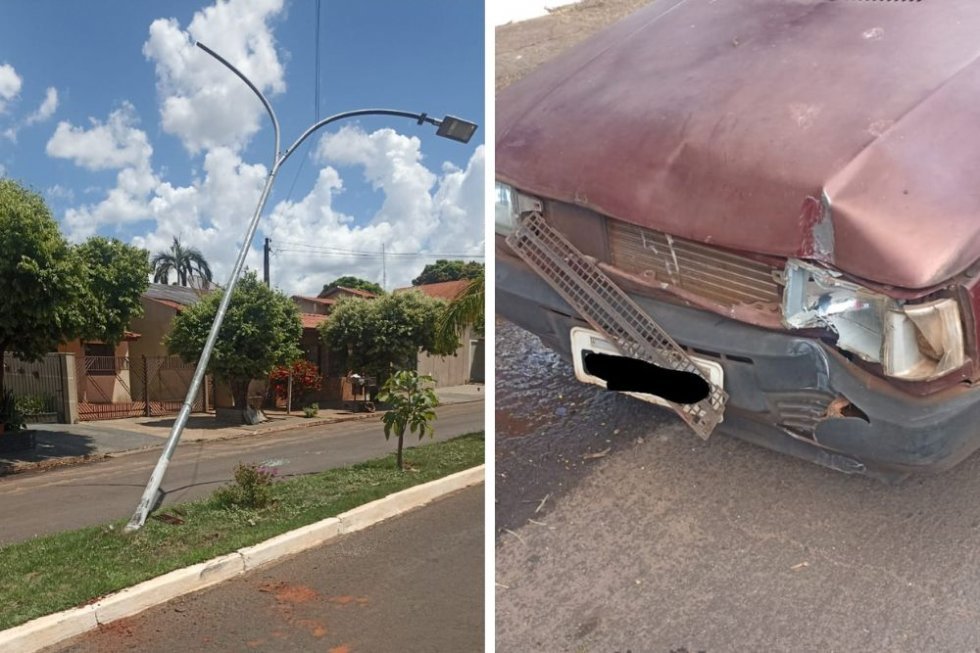 A Polícia Militar atendeu a um acidente de trânsito na Avenida Brasil, em Ivinhema. Um veículo Fiat Uno colidiu com um poste metálico de iluminação pública, causando danos à estrutura do poste e a um refletor de LED.