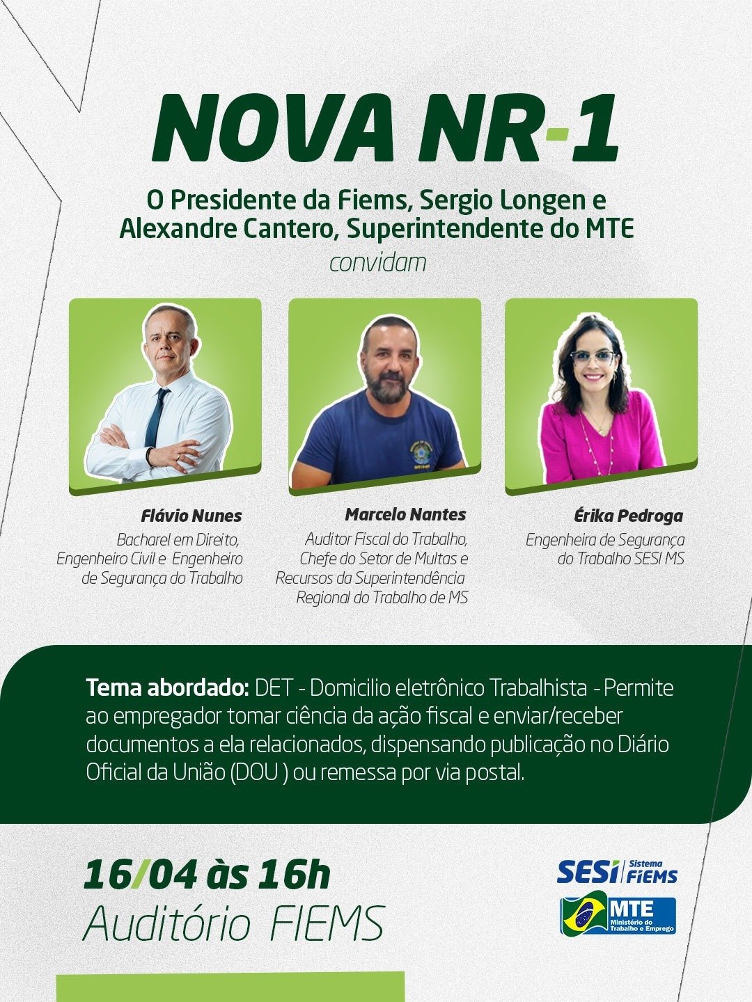 Com foco no Domicílio Eletrônico Trabalhista (DET), o encontro tem como objetivo orientar empregadores, profissionais de Recursos Humanos e de segurança do trabalho sobre as implicações, benefícios e procedimentos relacionados à implementação da nova NR-1.
