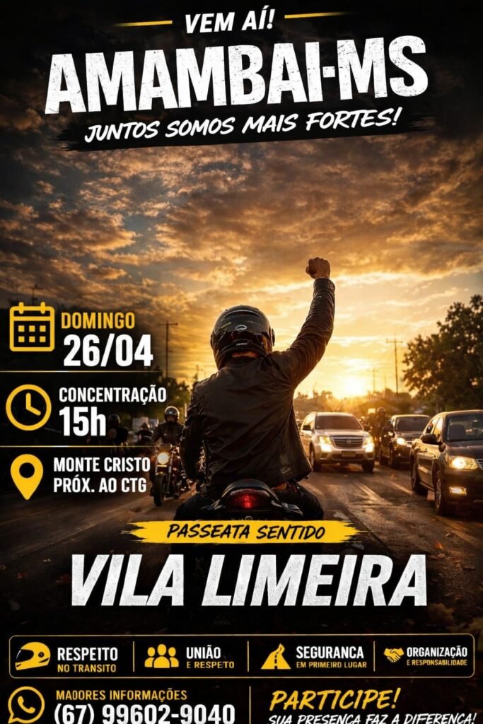 O organizador também utilizou as redes sociais para reforçar o chamado à população. Em sua mensagem, ele destacou que o evento não se limita a uma simples motociata, mas representa um movimento maior, onde homens, mulheres, motos e carros estarão nas ruas em um ato de respeito e organização. "Amambai vai sentir o ronco dos motores e a força de um povo unido. No dia 26, a cidade será palco de uma grande concentração que vai marcar história", escreveu.